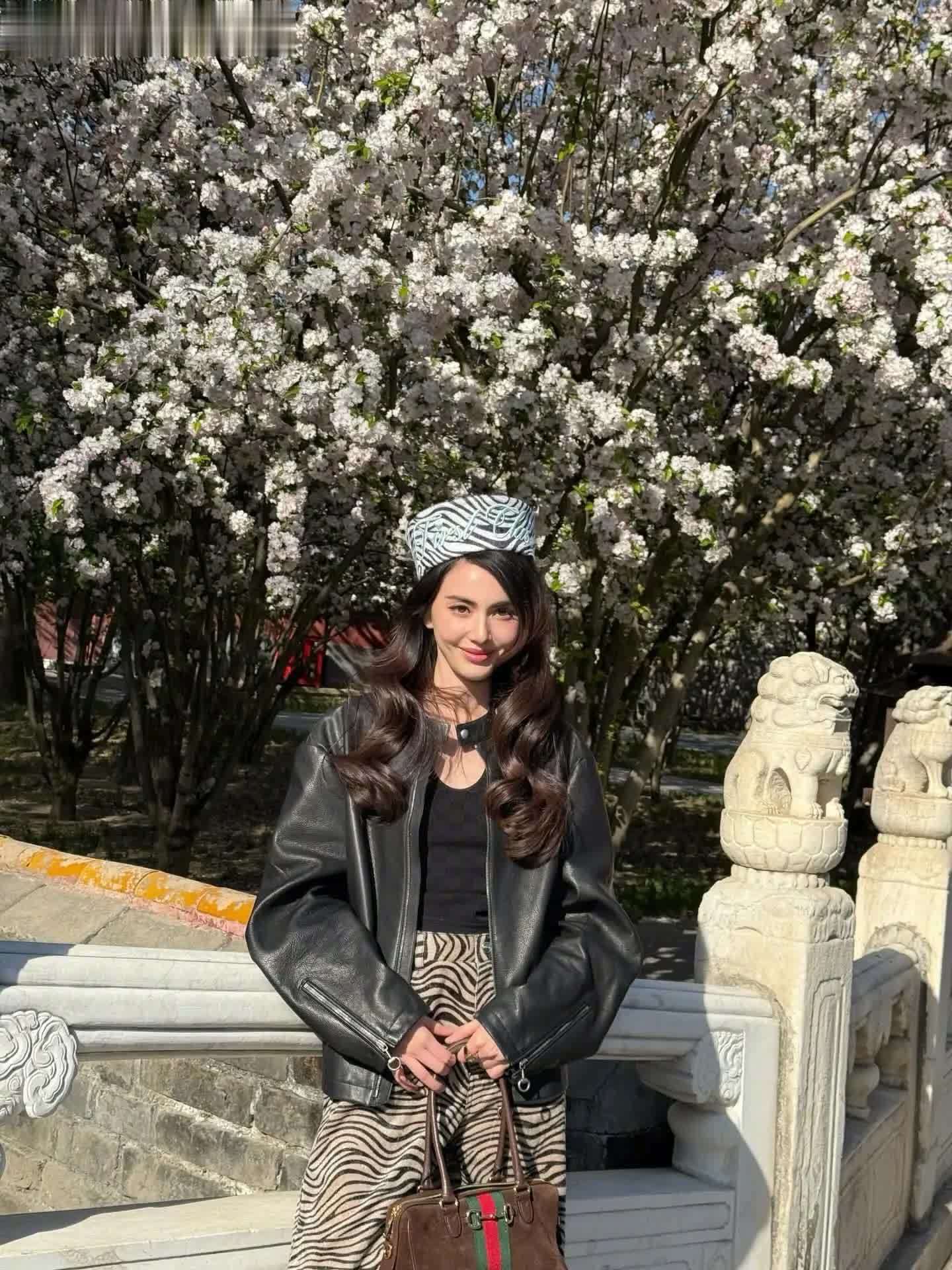 黑色立领皮衣外套,内搭黑色针织吊带衫,下半身搭配斑马纹阔腿裤,手拎酒红色单肩包,配色上简约温柔又带点帅气感,也是经得住考验的!在自然灯光下皮肤状态也很好!